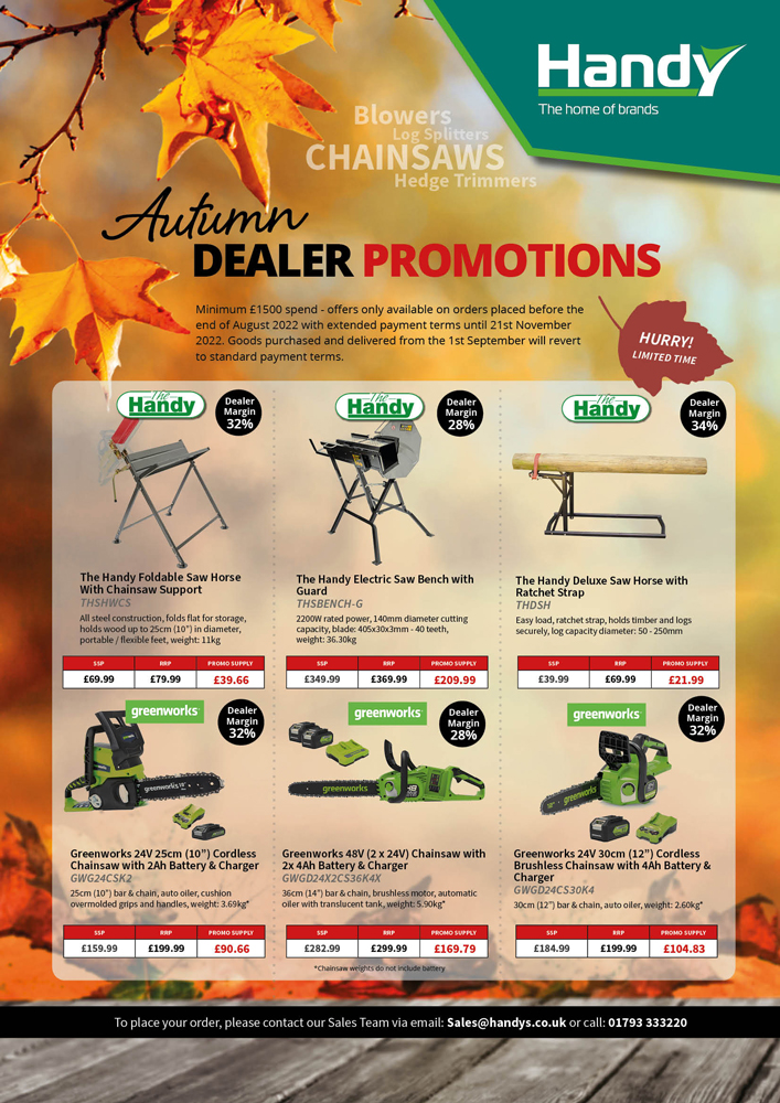 British garden equipment manufacturer Handy has announced a raft of promotions across a substantial range of garden machinery ideally suited to Autumn tasks. Retailers can benefit from increased margins on leaf blowers, log splitters, chainsaws, hedge trimmers and more, of up to 34%.